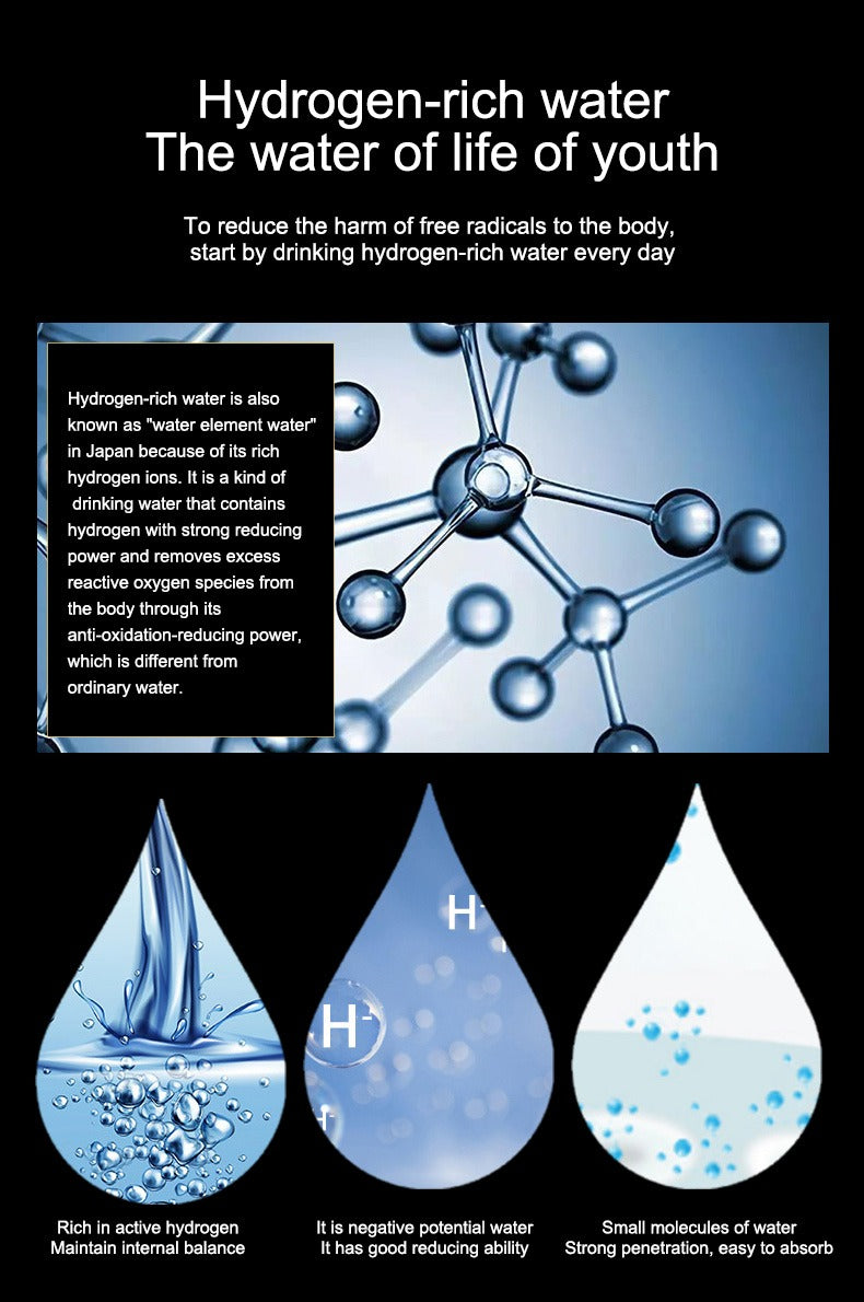 - Turn any drinking water into hydrogen rich water instantly